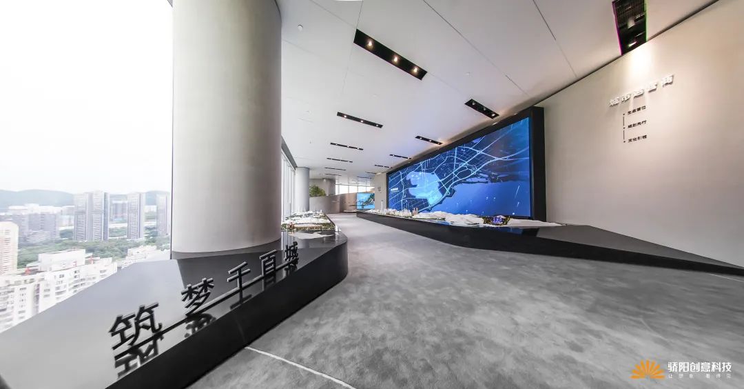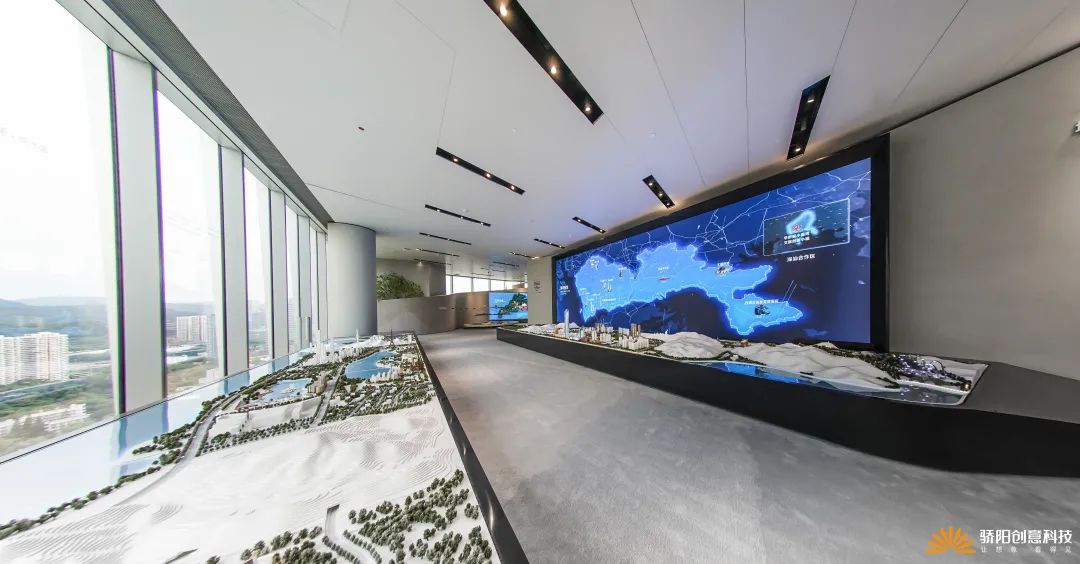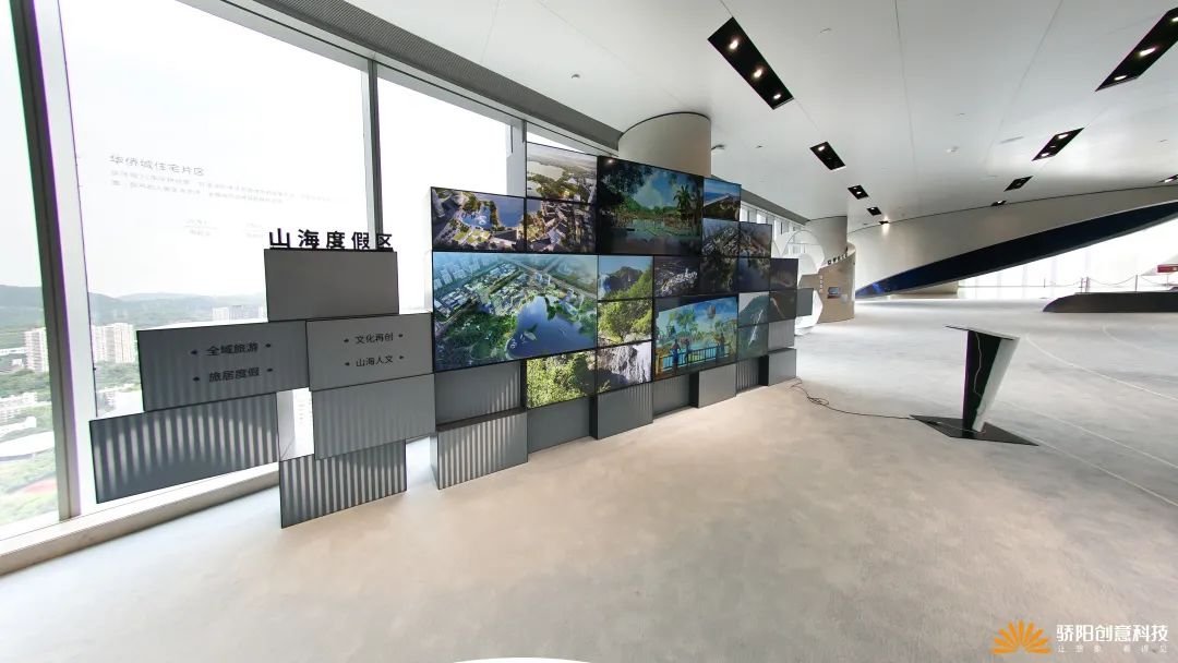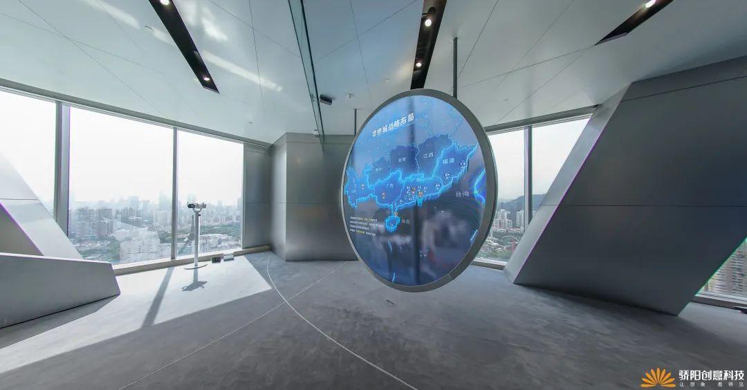 展馆所处的这栋华侨城大厦,伫立在深南大道边上,北望欢乐谷,南瞰深圳湾,西临科技园,东承福田核心区;展馆位于30楼,拥有华侨城总部片区360度景观视野,正是展馆展示内容的实景补充;因此,在本展馆所在楼层的一圈落地窗前,我们一共设置了6台VR景观望远镜,让访客在参观展馆的闲暇之余,感受下华侨城大厦本身所处的整个总部片区的VR鸟瞰全景。