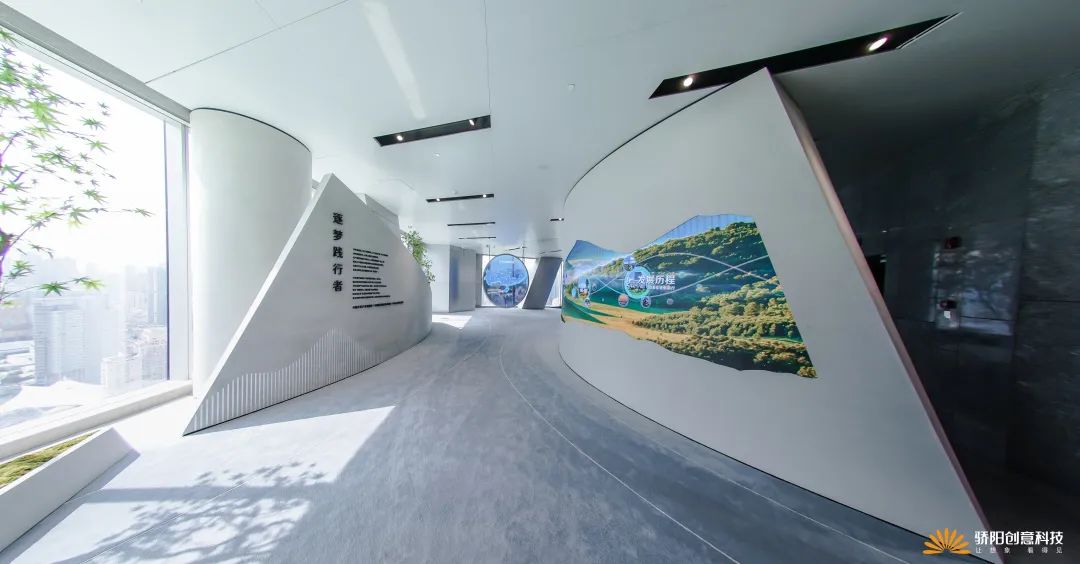 为了凸显对原生山水的敬重,我们在展示形式上弱化了现代科技的生硬,将科技感隐藏在每一个独立景观小品中;在交叉空间处留白、不刻意堆砌展项,空间大开大合,用艺术氛围包裹现代科技。